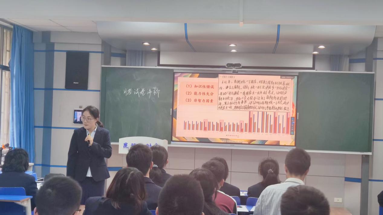 10 月 13日,崔德玉老师和高 2026 届 4 班同学带来精彩课堂《月考试卷评析》。本次教学以“以考促学,以学定教”为基本立意。以月考数据为镜,聚焦学生失分痛点,从必备知识、答题方法、思维能力和非智力因素等多维度进行全面分析。针对学生考试中出现的学习短板“对症下药”,采取“概念深化+方法建模+变式训练”的闭环教学思路。如:精讲核心概念如“经世致用”,梳理客观题做题基本思路与注意事项;构建材料题“三步答题法”,再通过针对性变式训练促使学生实现从“听懂”到“会做”的能力迁移,并强化书写规范与时间管理,培养学生严谨细致的应考习惯,实现历史素养与应试能力的双轨并进。