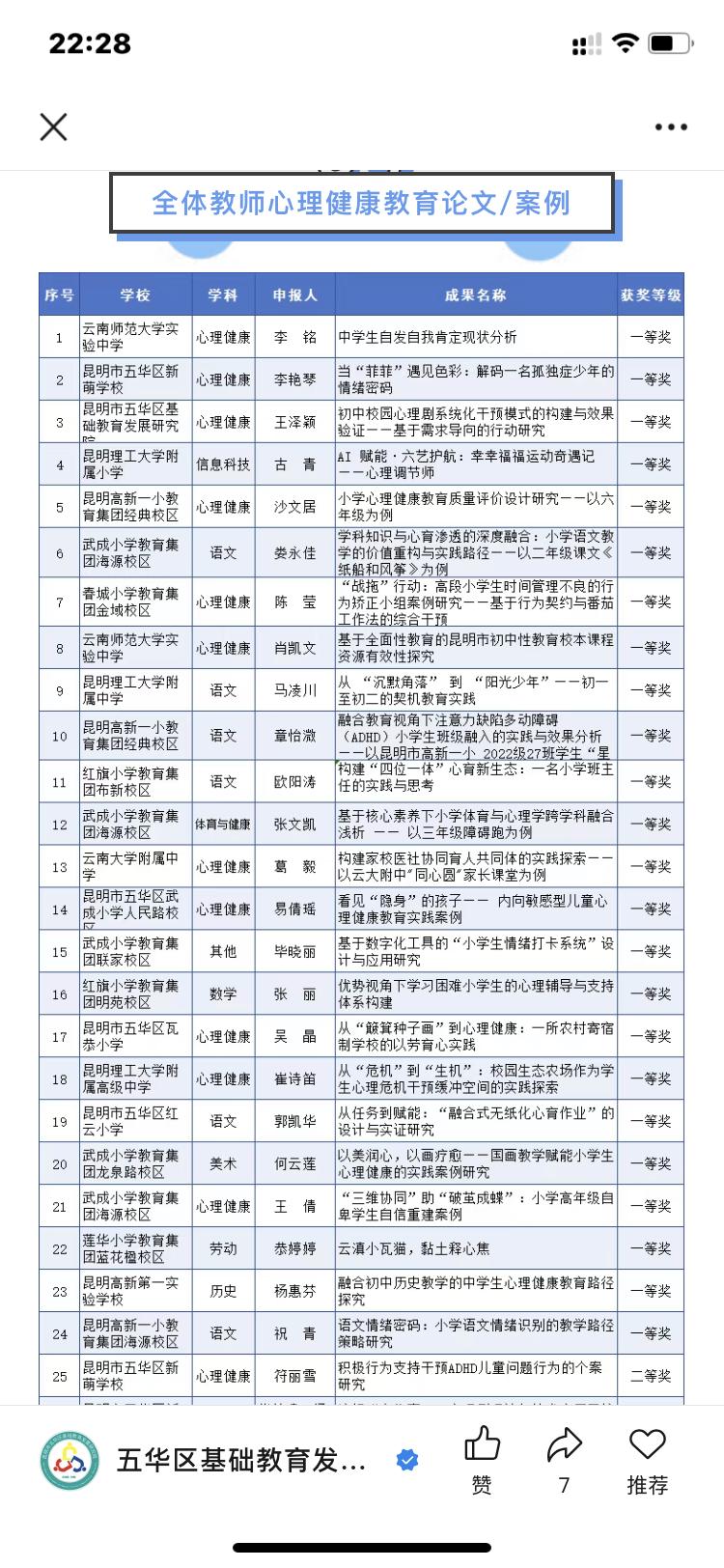 近日,昆明理工大学附属高级中学心理健康教育教师崔诗笛在五华区中小学心理健康教育论文及案例评选中喜获佳绩。其两篇原创成果分别斩获一、二等奖,展现了我校在心理健康教育领域的创新实践与专业实力。