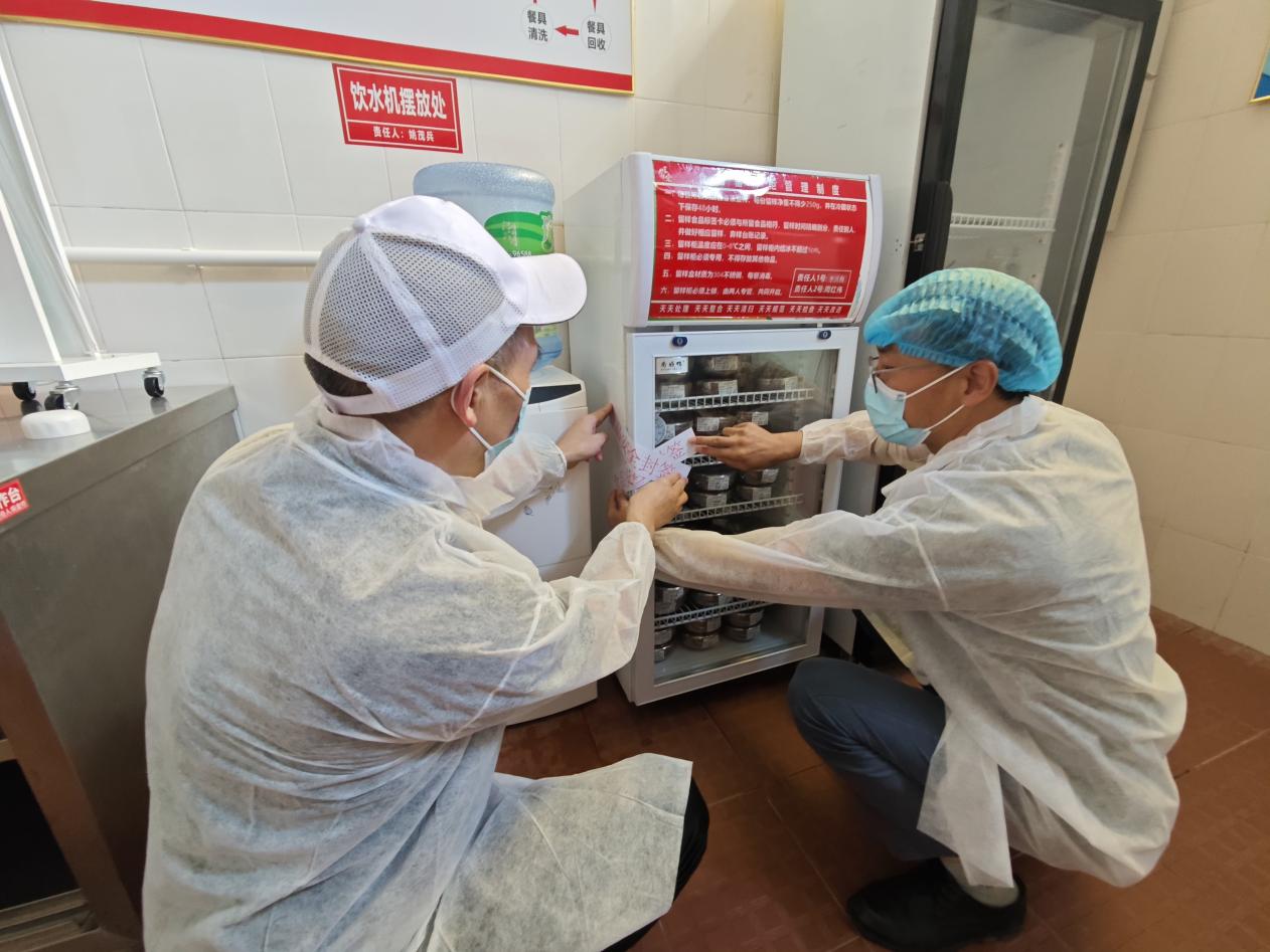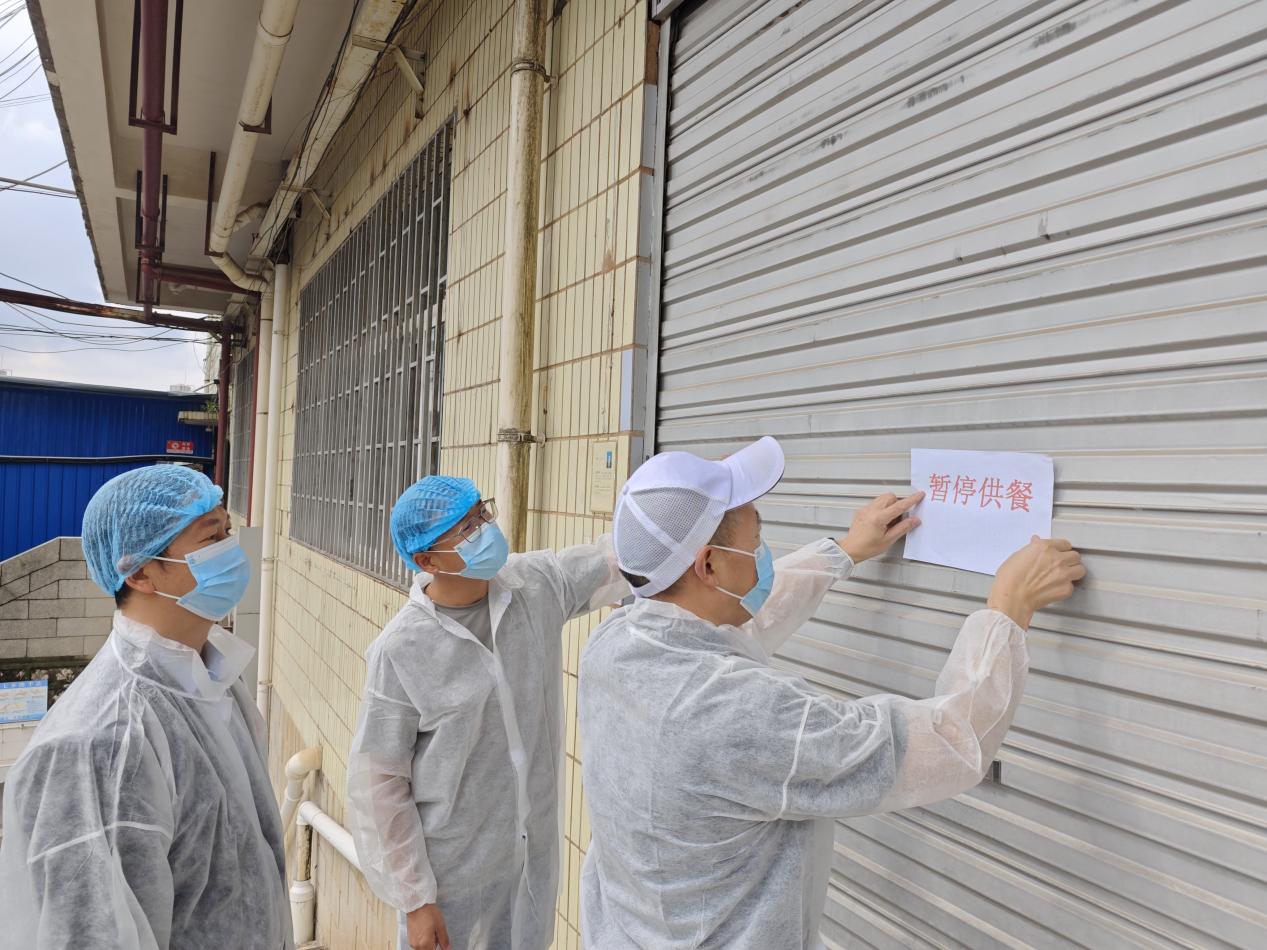 后勤保障中心通知食堂人员立即停止所有操作,对留样食品、食堂出入口等区域张贴封条,封锁现场。学校食品安全员前往食堂悬挂“暂停供餐”标识牌,确保在检查部门到达前,相关区域不受干扰。