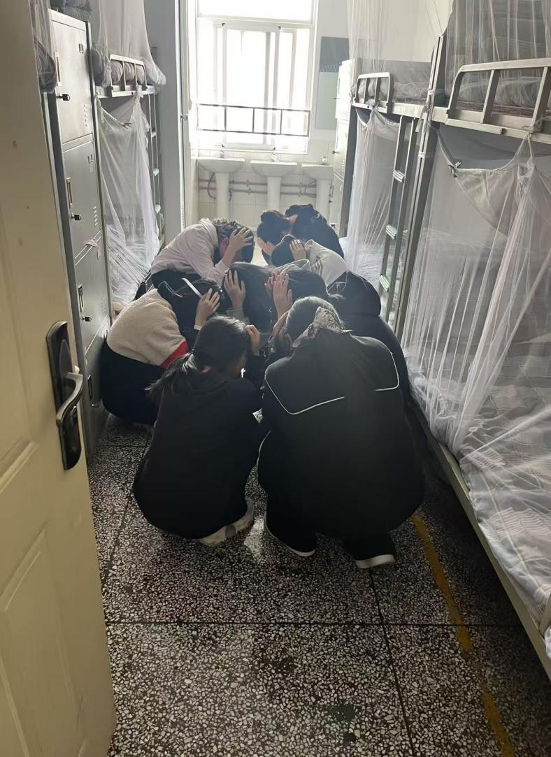 宿舍与教学楼各楼层点位教师全程值守,疏导人流、防范拥挤,及时处置突发情况。全体师生仅用2分46秒便安全抵达篮球场指定集合区域,各班迅速整队、清点人数,逐级上报汇总,整个过程紧张高效、规范有序。