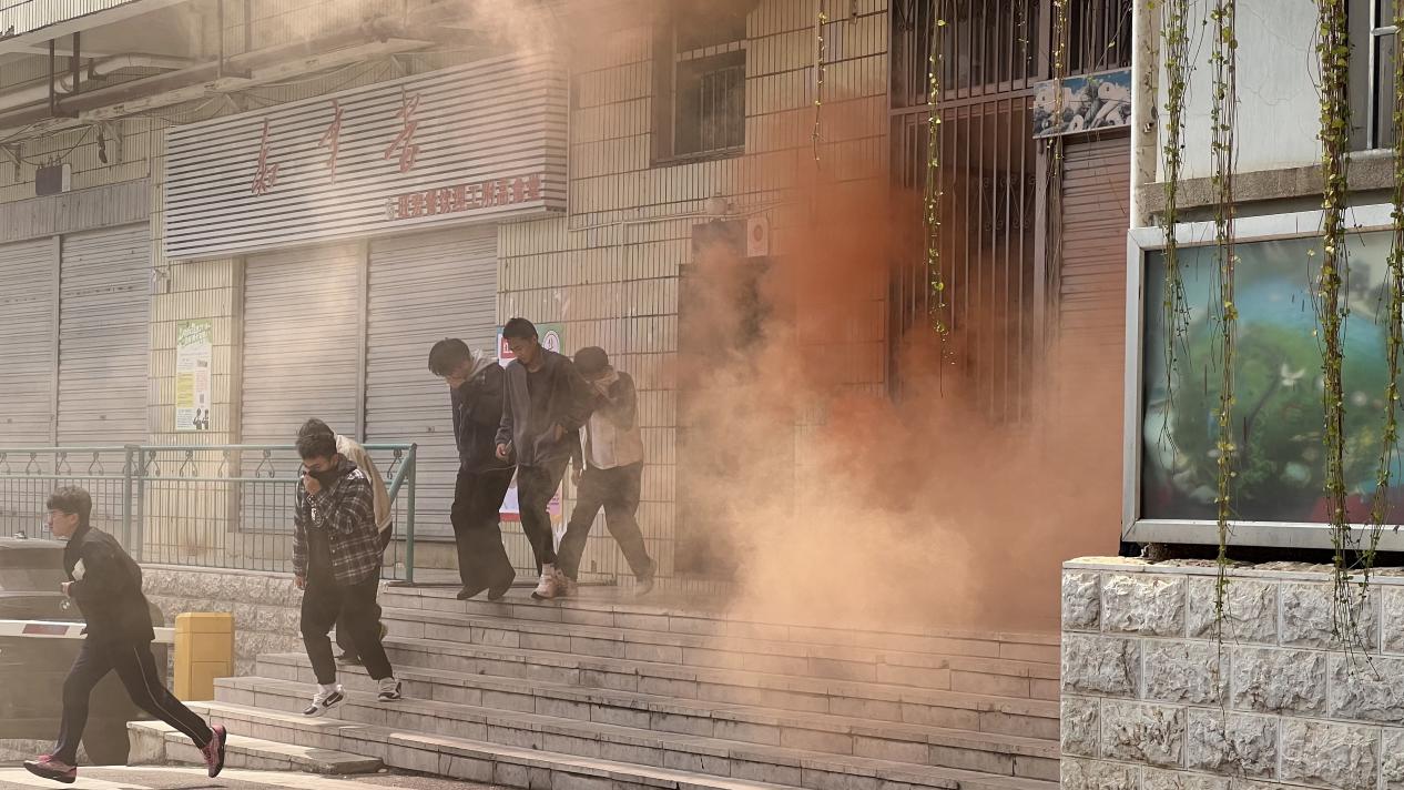 2分钟警报解除后,疏散环节正式启动。在班主任与点位教师的指挥下,同学们用手肘捂住口鼻、弯腰低姿,沿既定路线快速有序撤离。